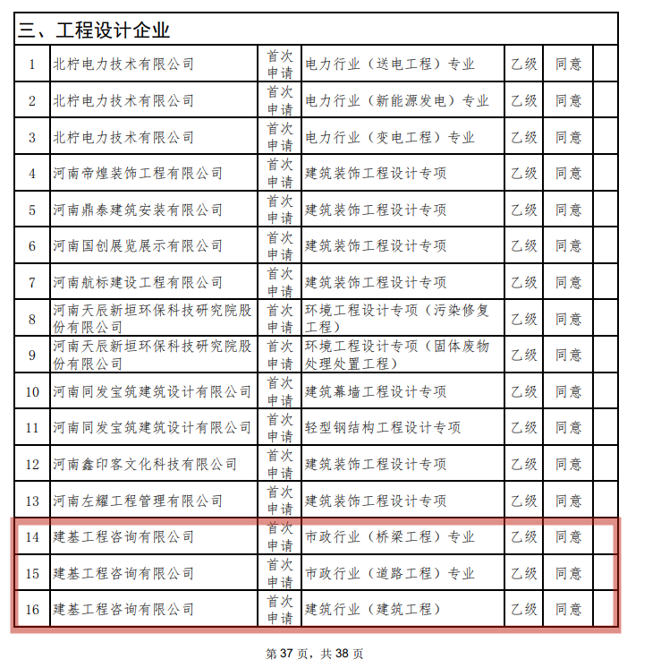 11月22日,在全體員工共同努力下,公司資質管理工作再傳捷報,成功增3項設計資質,分別是市政行業(橋梁工程)專業乙級資質、市政行業(道路工程)專業乙級資質、建筑行業(建筑工程)專業乙級資質資質,這些資質的獲得是公司在工程設計方面取得的又一次重要“升級”,為公司持續深耕區域市場,拓展新的業務領域,謀求新合作方式等市場戰略多元化發展奠定了堅實基礎。