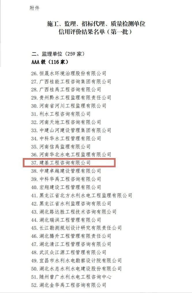 2024年1月19日,中國水利工程協會公示了《關于2023年度水利建設市場主體(施工、監理、招標代理、質量檢測單位)信用評價結果的公告(第一批)》。公司榮獲AAA信用等級,這一榮譽的獲得,不僅是對公司多年來誠信經營的肯定,更是對其在水利工程建設監理領域專業能力的認可。