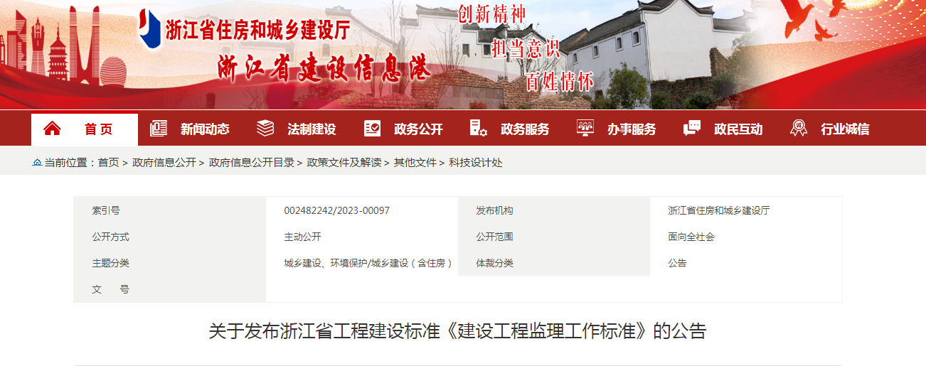 關于發布浙江省工程建設標準《建設工程監理工作標準》的公告