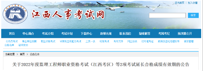 關于2022年度監理工程師職業資格考試(江西考區)等2項考試延長合格成績有效期的公告