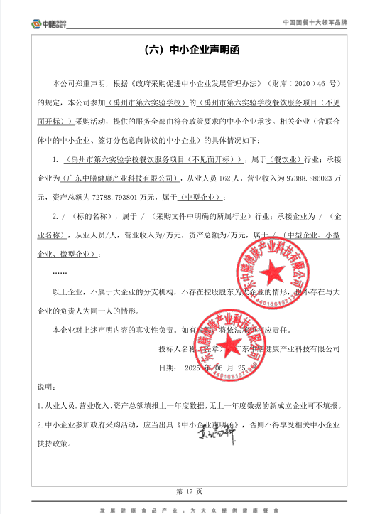 1 | 禹州市第六實驗學校餐飲服務項目 | 詳見 附件 | 詳見 附件 | 服務期1年(期滿考核,合格可以續約四次) | 符合國家相關法律規定及現行行業標準與規范的要求,并滿足采購人要求 | ||