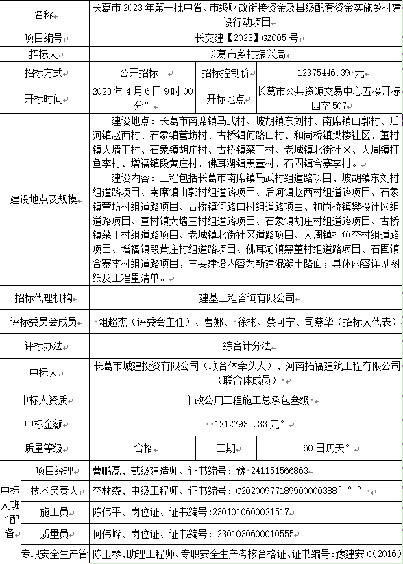長葛市2023年第一批中省、市級財政銜接資金及縣級配套資金實施項目(不見面開標)中標公告